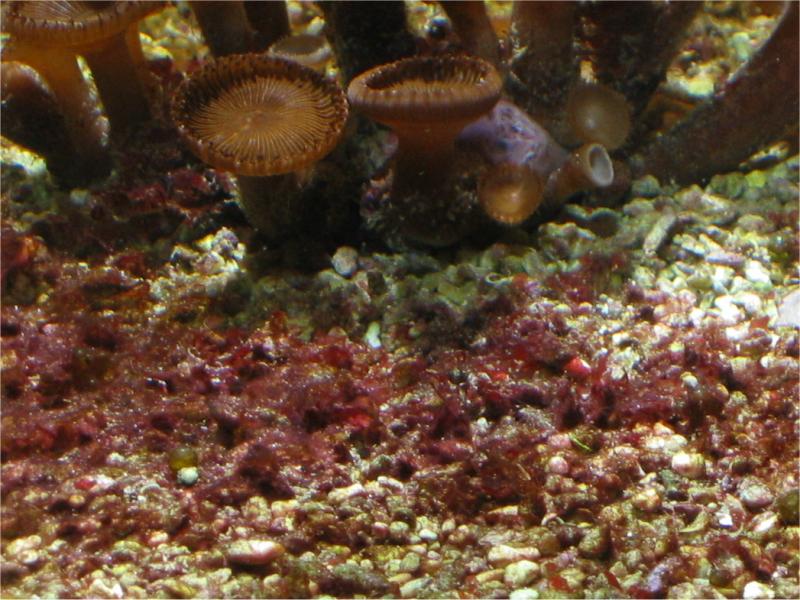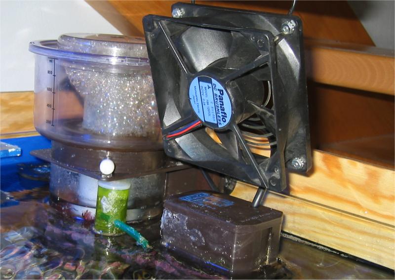 25.07.2003 Trotz des Aufkommens einer Algenplage habe ich 7 neue Korallenableger eingesetzt. Ich wusste nicht, wie schnell sich diese Braunalgen vermehren können und habe mir daher erst einmal keine Gedanken gemacht. In den folgenden Tagen stieg die Temperatur im Becken auf bis zu 29,5 Grad (draußen 36Grad). Die Algen hatten jeden Tag wieder den Boden und teilweise die Deko überwachsen. Mein Händler hat mir freundlicherweise einen Diatom Filter ausgeliehen, mit dem ich die Algen mehrfach abgesaugt habe. Da ich am Becken nichts verändert hatte und ich kein Nitrat oder Phosphat messen konnte ging ich davon aus, dass es sich um Algen handelt, die durch Silikat im Leitungswasser entstehen. Darauf hin habe ich Silicarbon und JBL SymecMicro Filtervlies gekauft und in den Schnellfilter gegeben. Außerdem habe ich noch einen PC Lüfter über dem Becken angebracht um die Temperatur zu senken.