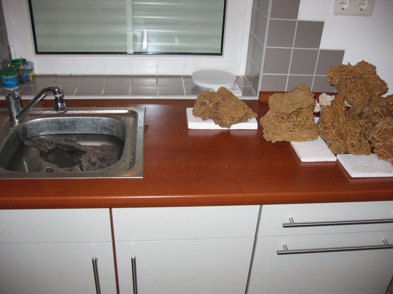 Ich begann damit 2 Eimer Wasser abzulassen. Ein Gutes hat der IKEA Schrank, nämlich Rollen und somit konnte ich Ihn leicht wegrollen und das neue Becken an diesen Platz stellen. Nach dem Einlegen einer Plexiglasscheibe habe ich die trockenen Steine eingebracht. Na ja, mit 4 Tuffsteinen konnte ich natürlich keine tollen Riffpfeiler aufbauen. Die Tiere und lebenden Steine wurden in ein kleines Glasbecken, Schüsseln usw. ausgelagert. Das Wasser habe ich in allen auffindbaren Behältnissen aufgefangen, damit ich als erstes an den Bodengrund herankam. In allen Kanistern hatte ich schon Salzwasser angesetzt somit standen diese nicht mehr zur Verfügung.