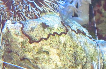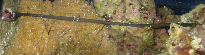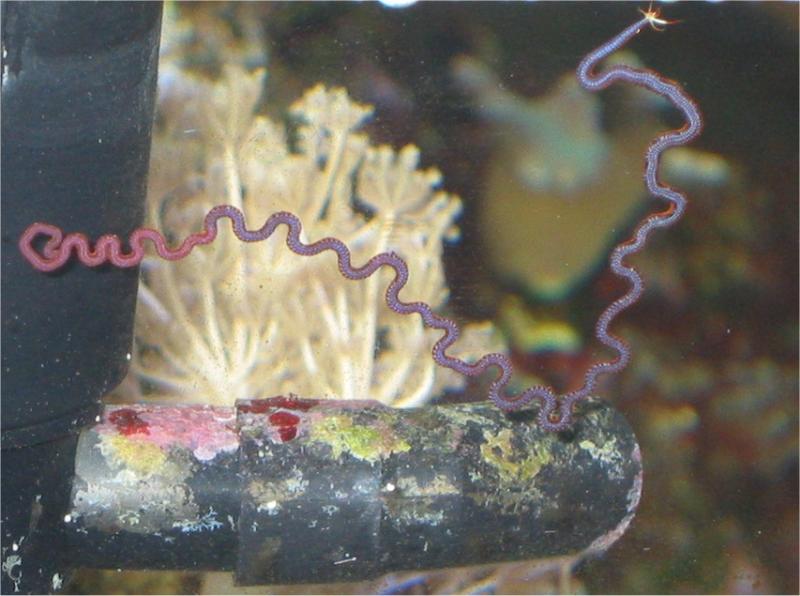 30.09.2003 Als ich Abends in das Becken schaue, traue ich meinen Augen nicht und sehe einen 30cm langen Wurm, wie er gerade an einer Schnecke frisst. Da ich ihn nicht gleich herausgefischt hatte, war er dann erst mal 3 Tage verschwunden. Als ich ihn wieder entdeckte, entfernte ich ihn sofort und setzte ihn in das 12l Fensterbank Becken. Es handelt sich um einen Nematoden, ein Ringelwurm wie jemand im Meerwasserforum herausfand. Hat mich sehr gefreut, dass da jemand auch über solche Tiere Bescheid weiß.