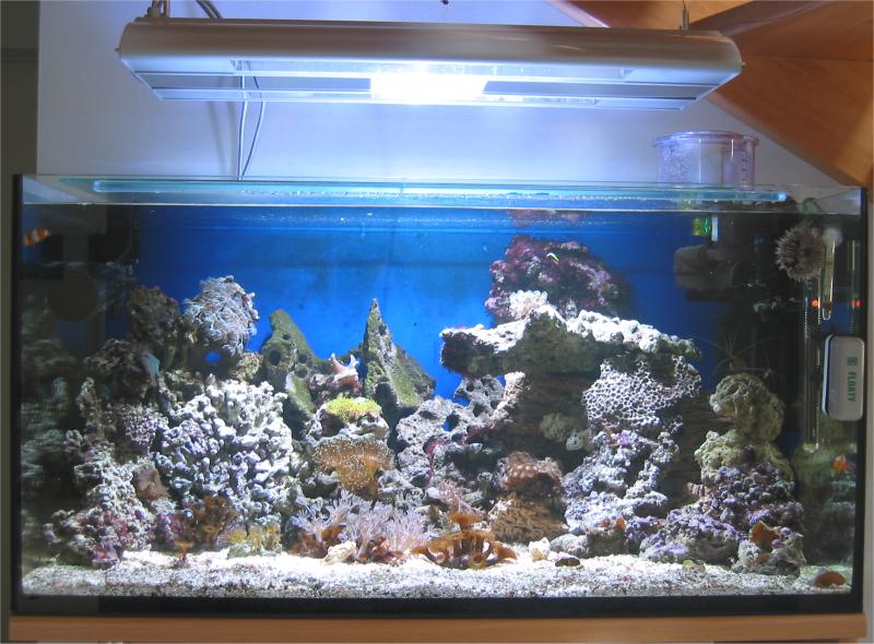 09.03.2003 Ich habe günstig eine tolle neue HQI Leuchte RIGA von Aqua-connect bekommen und gleich montiert. Sie hat 150 Watt und 2 18 Watt Röhren integriert. Macht ein super schönes Licht und ich habe kein externes Vorschaltgerät mehr herumliegen. Außerdem habe ich den Steinaufbau verändert und 3 neue lebende Steine (4kg) eingesetzt.