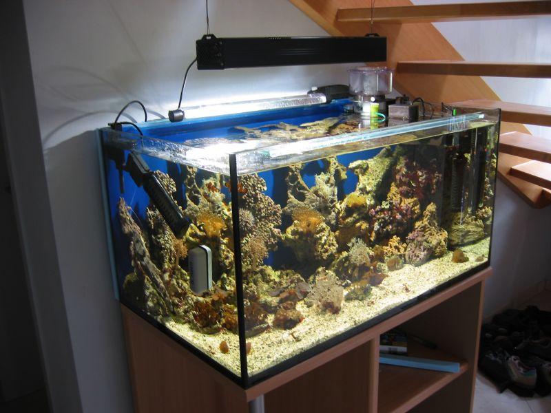 Nachdem ich den Versuch mit dem 112l Riffaquarium als erfolgreich betrachte, habe ich mir nun ein 300l Becken (100 mal 60 mal 50cm) angeschafft. Im nachhinein denke ich war dieser Einstieg ganz gut, weil Probleme in einem kleinen Becken leichter zu beheben sind. Bei einem 80er (112liter) Becken kann man leicht einmal die Steine herausnehmen und mit der Zahnbürste bearbeiten wenn Algen auftreten. Auch die laufenden Kosten sind bei dieser Größe mit einem Süßwasser Aquarium zu vergleichen.