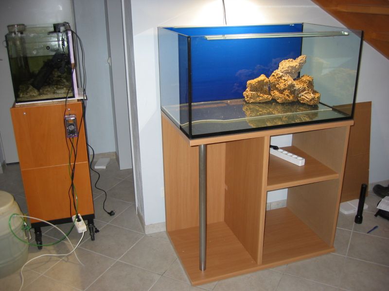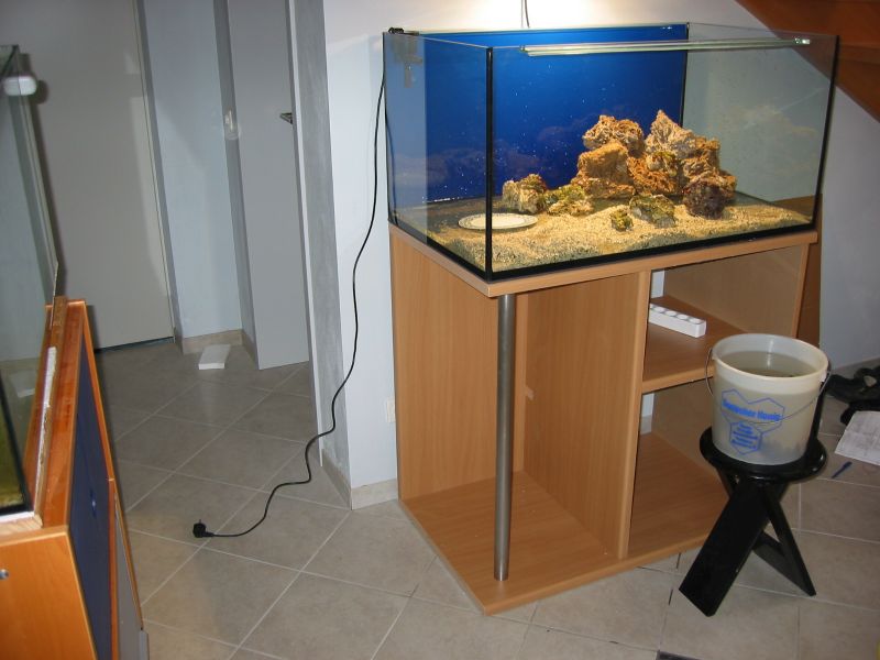 Den Bodengrund füllte ich als erstes in das neue Becken. Dann folgte abwechselnd Salzwasser aus dem alten Becken und frisches. Nach und nach habe ich die lebenden Steine eingesetzt und alles Wasser welches ich angesetzt hatte eingefüllt. Voll wurde das Becken damit natürlich nicht. Nach dem sich der leichte Nebel etwas gesetzt hatte, die Temperatur und die Dichte OK waren habe ich auch die Tiere wieder eingesetzt. Dazu habe ich das kleine Becken einfach im Großen schwimmen lassen und ab und zu etwas Wasser getauscht.