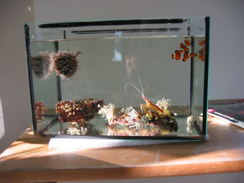 12.05.2003 Mit den Fischen hatte ich wieder kein Glück. Beide Anemonenfische sind innerhalb von 3 Tagen gestorben. Bei einem quollen die Augen hervor und der zweite hatte einen weißen Pilz im Maul. Wahrscheinlich habe ich diese spezielle Anemonenfisch krankheit im Becken und die ersten beiden sind dann wohl auch daran gestorben. Eine große Krabbe konnte ich jedenfalls nicht finden.